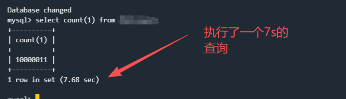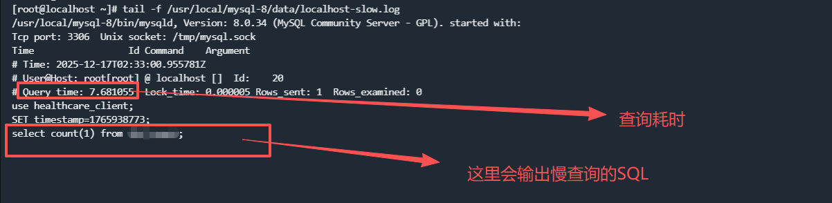 另起一个窗口,执行tail -f /usr/local/mysql-8/data/localhost-slow.log监控慢查询日志内容,然后这边执行一个超过1秒的查询,如下图所示: