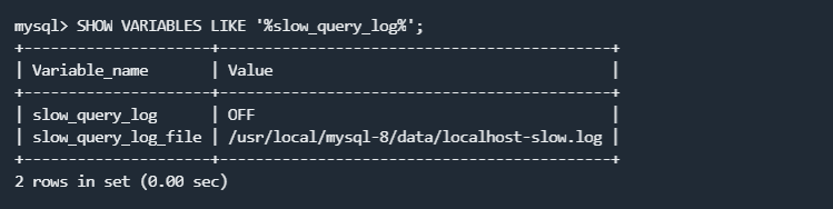 连接数据库,使用SHOW VARIABLES LIKE '%slow_query_log%';命令查询慢查询日志开关,输出如下: