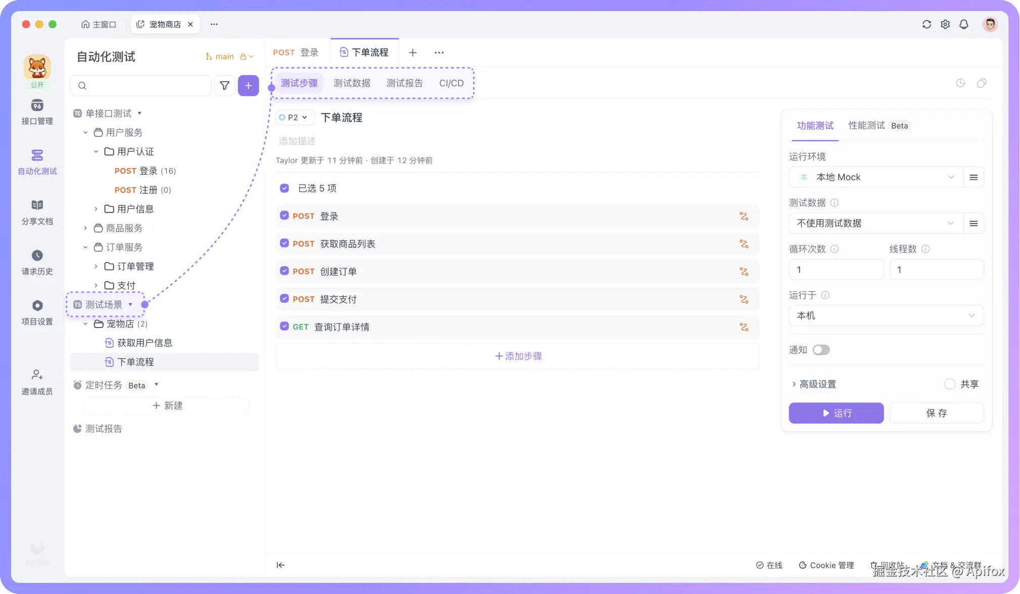 在 Apifox 中,新建一个测试场景后,你可以将多个接口或已有的用例按顺序加入进来,明确每一步的执行顺序。