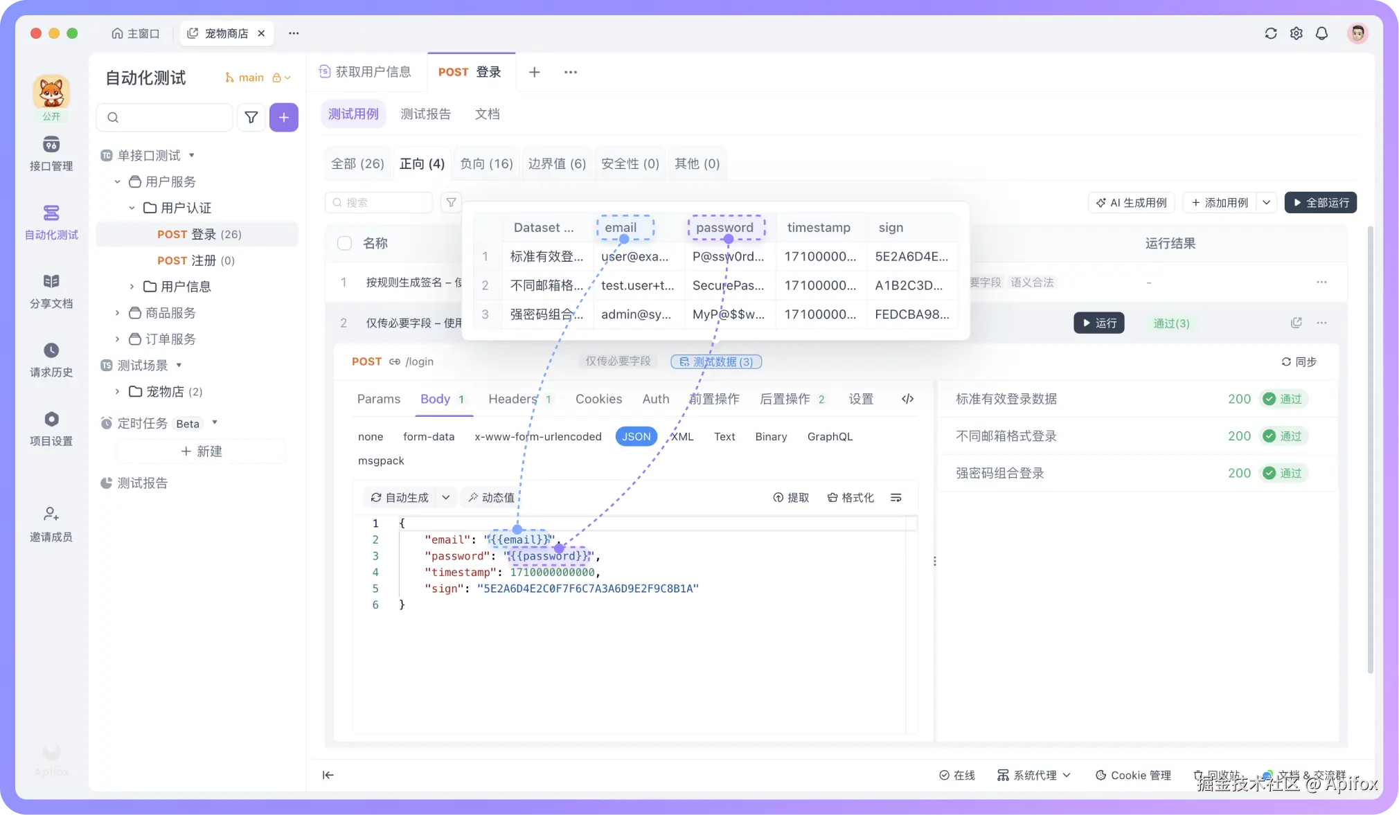 在测试用例中,你可以通过 {{变量名}} 的方式引用这些测试数据,将变量插入到请求参数、请求体等位置。测试执行时,Apifox 会从数据集中依次取值并发起请求,从而在不重复编写用例的情况下,用不同数据多次验证同一个接口。