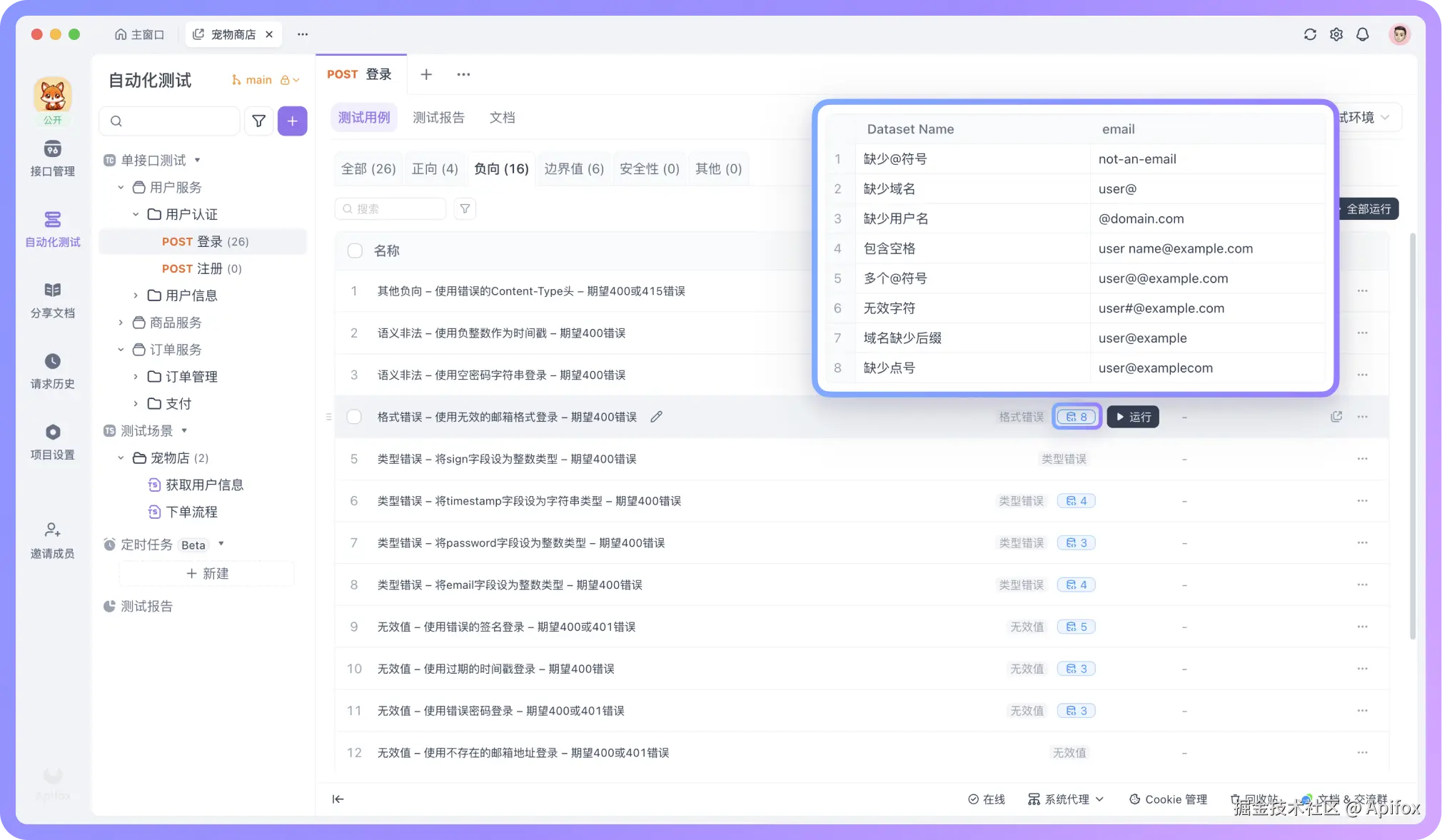 而在异常或边界场景的测试用例中,测试数据则会刻意构造不符合规则的输入 。例如「使用无效的邮箱格式登录,期望返回 400 错误码」这一类用例中,数据集中会包含缺少 @ 符号、缺少域名、包含空格等不同形式的非法邮箱,用来验证接口是否能够正确识别并拦截异常请求。