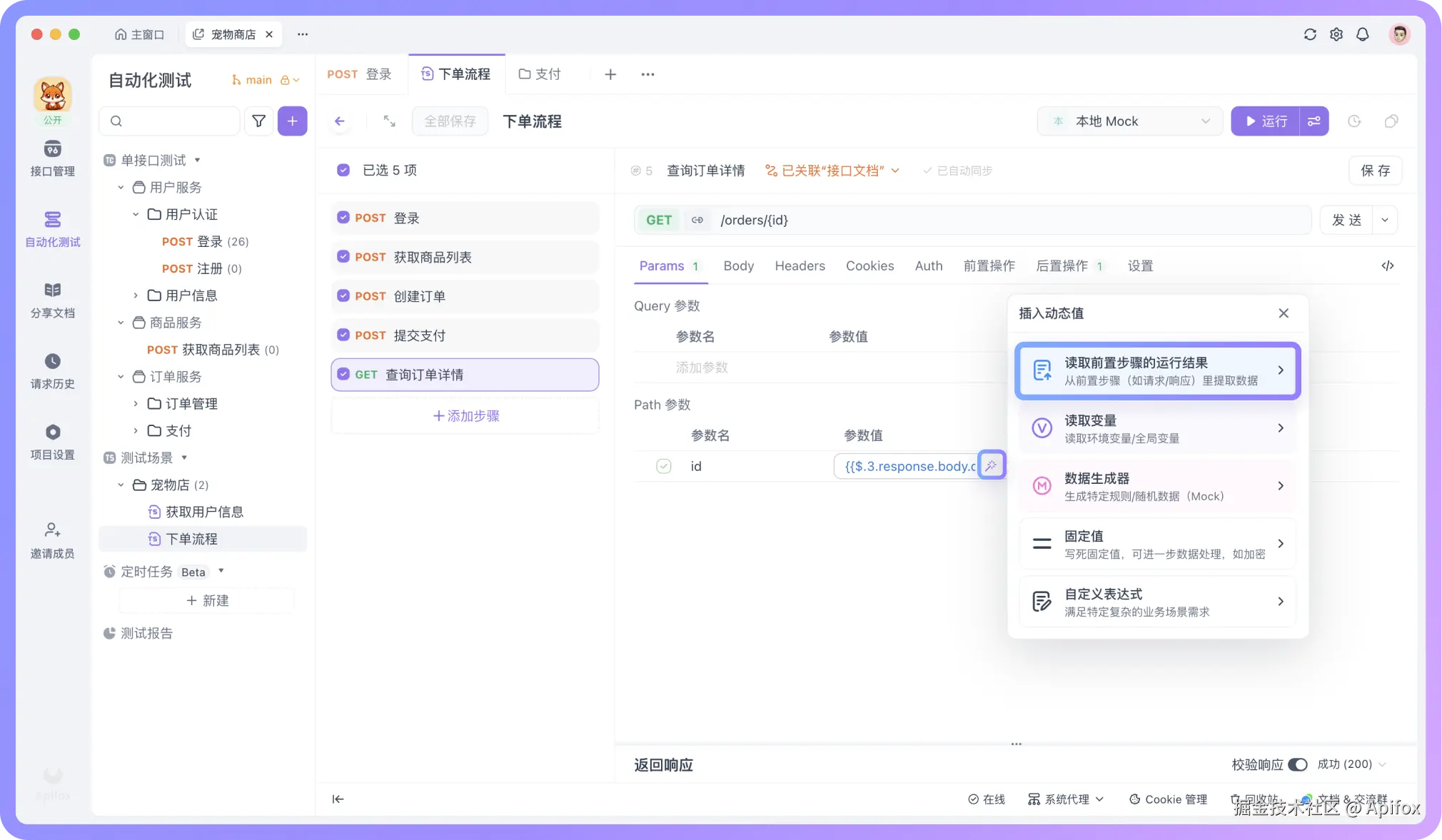 当接口之间存在依赖关系时,测试场景允许你把前一步接口的返回数据,作为变量传递给后续步骤使用。比如"创建订单"接口返回的 id,可以被直接用于后续的查询或更新操作。