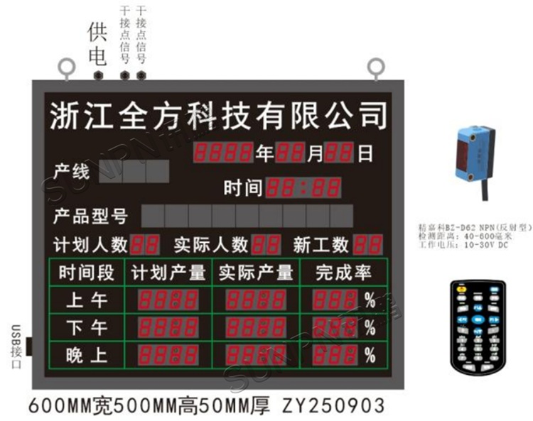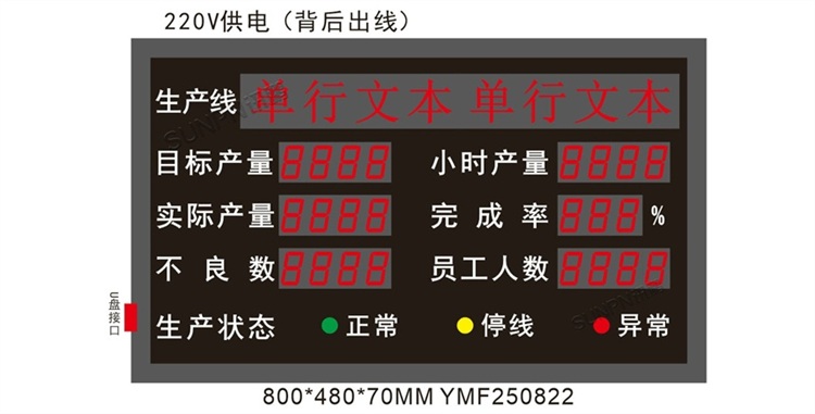 **尺寸与显示:**看板尺寸800mm×480mm×70mm,采用1.8寸共阴数码管(3.75单元板),确保数据清晰可读;