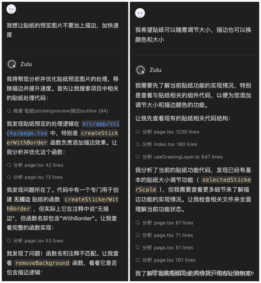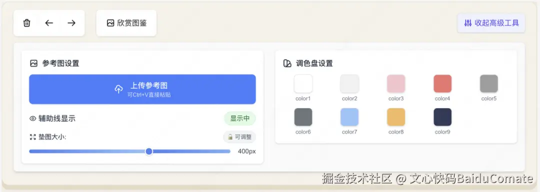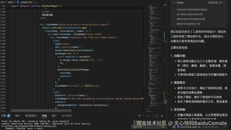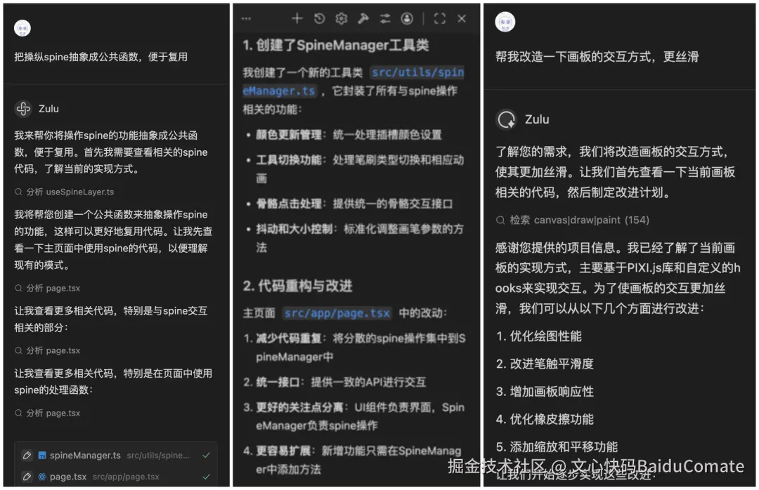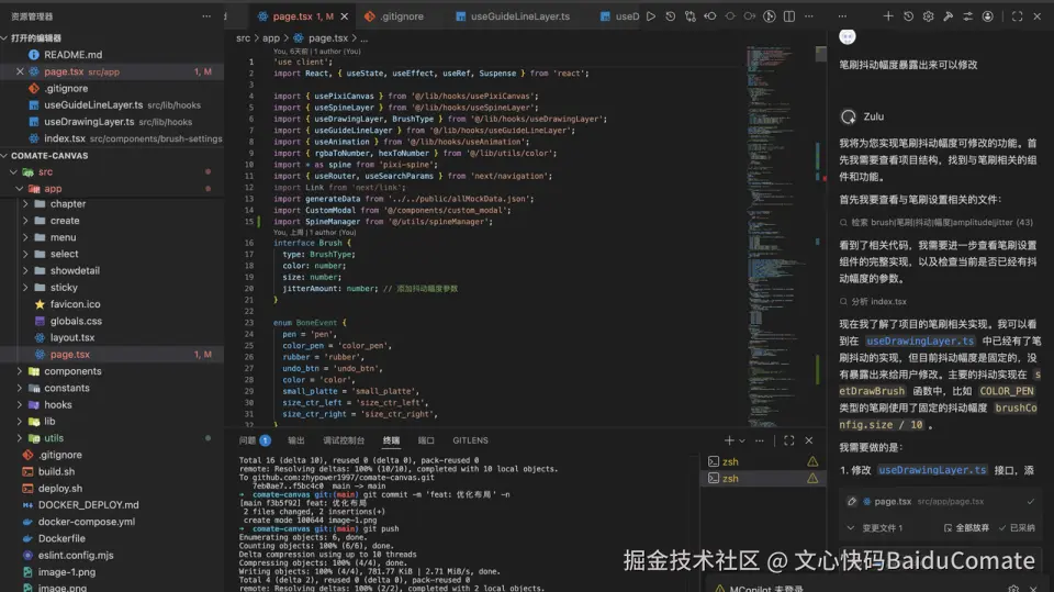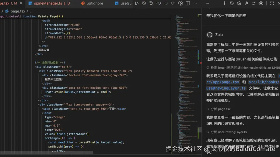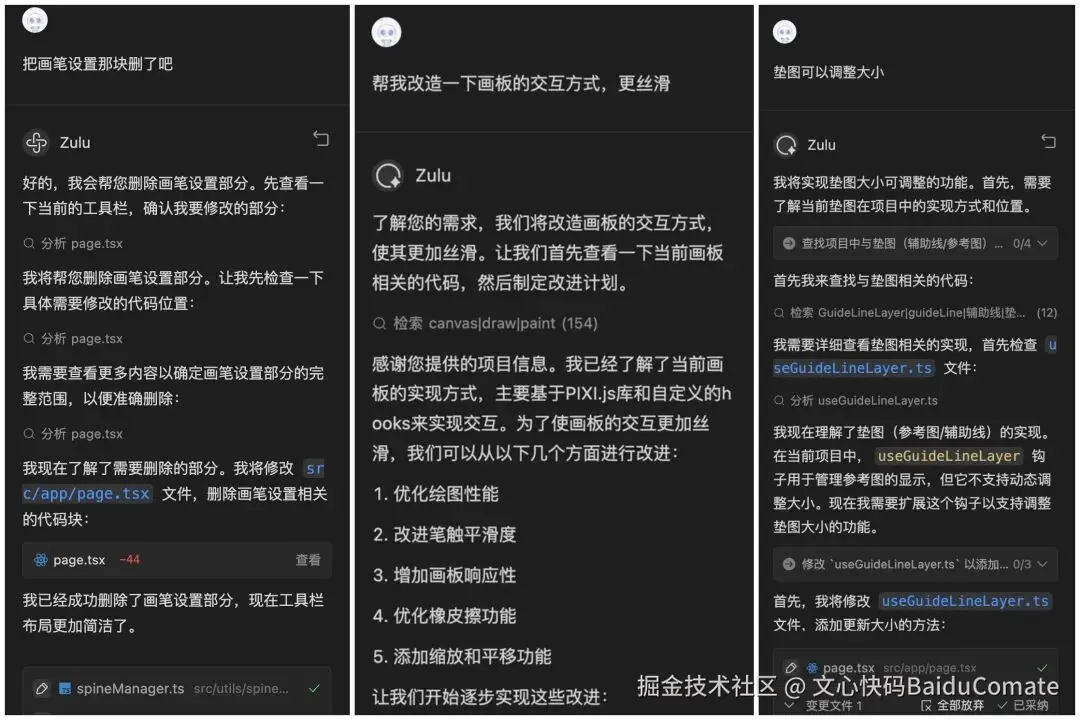11月份,看到了百度文心快码"CCF程序员大会码力全开:AI加速营"活动宣传,尝试使用了Comate,感觉一下子提升生产力,就开始把之前难以落地的想法都一一实现了,还做了固定元素创意功能,优化了画板交互,更符合操作逻辑(比如选完色块就切到上色笔刷,避免认知错位)。我和Zulu的会话,核心是打磨交互逻辑、实现新功能、重构代码、提升响应性能。尤其加了垫图功能,提升了画板的通用性,也是我最最满意的功能,用户现在可以随便看到哪个画比较好就截图,到画板页面直接CtrlV粘贴用做参考图,这个功能大大提升了用户体验。