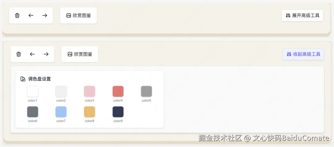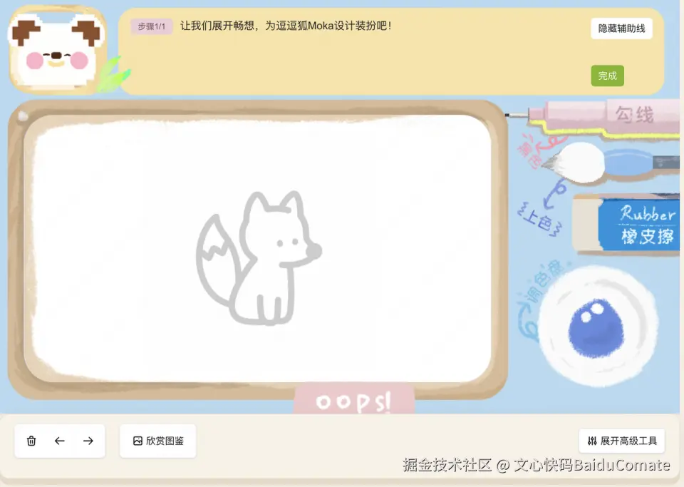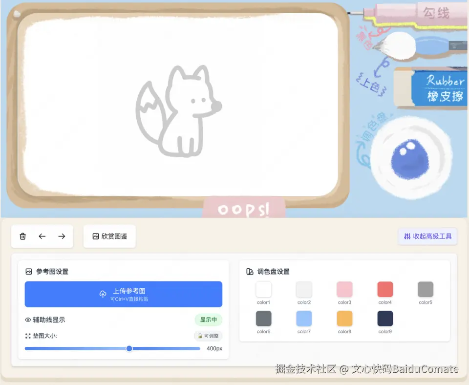 首先,我使用Comate完成了笔刷的优化,并把配置项(抖动幅度、笔刷粗细)暴露出来,可以在实际操作中动态调整,找到最合适的数值。我认为一些功能用户需要自主调节,于是让Comate帮我暴露出来,但是又不希望影响用户决策,于是使用Comate编码,折叠了底部「高级工具」,用户可以控制调色盘的色值,选择自己喜欢的配色。同时增加了撤销和回退功能、一键清空画布的功能。从之前每次画错都要小心用橡皮擦半天,变得可以任意撤销。但是在过程中,又觉得点击按钮的操作方式有点麻烦,于是让Comate加了快捷键控制撤销和回退。Comate几乎3分钟不到就完成了操作,让人十分惊喜,还顺便修复了一个橡皮擦Bug。