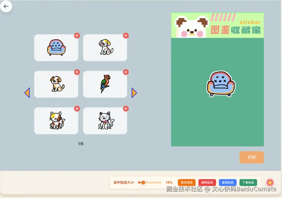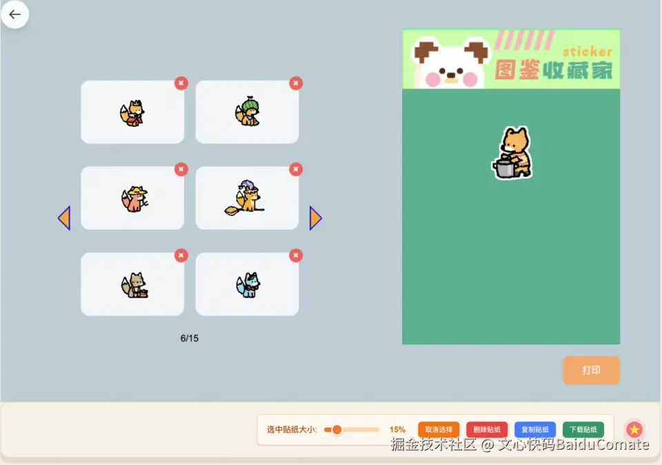 Comate自动做的代码精简、冗余逻辑剔除,还有公共函数抽离,直接让项目跑起来的流畅度飙升。《趣绘像素岛》是骨骼动画项目,我自己也手写了代码,但是自己的代码存在不少重复调用和性能瓶颈,用Comate重构后,动画渲染的帧率稳了很多,交互时的卡顿感直接消失。包括后续加一些动画,进行动画调度,能帮我读取分析npm包,给出对应的API方法。Comate帮我把画板的垫图、撤销回退做得很好,我现在能轻轻松松截图,然后到工具页面直接Ctrl+V贴进去,就可以直接临摹了,也把贴纸的导出加上了直接粘贴到剪贴板,这块用户体验应该很好。