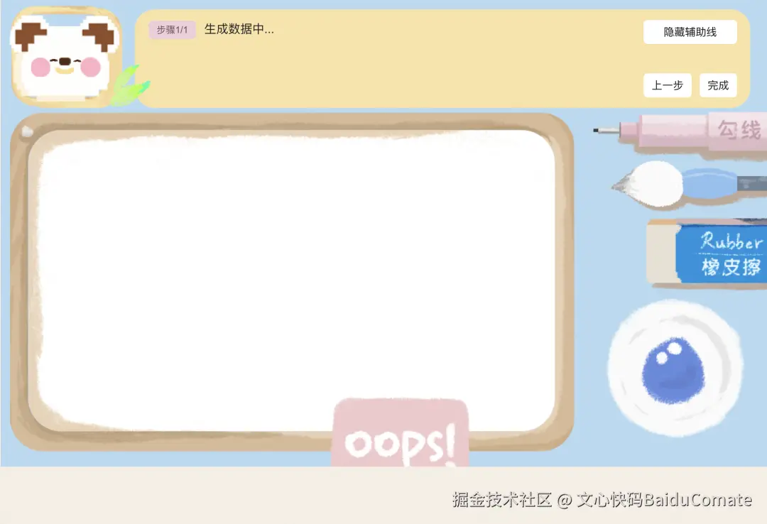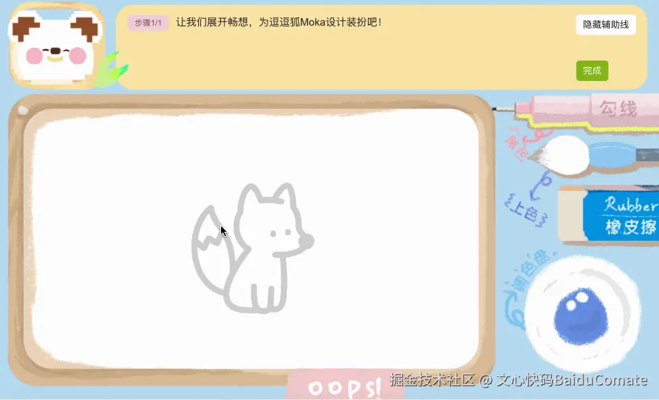 其实创意灵感在9月就想到了,比如我个人喜欢画画,也愿意教别人画画,但是一个人的力量其实不算大,时间也很有限,希望有一个平台型工具,可以根据每个人的情况和基础,给出不一样的解决方案,这是AI能做得比较好的点。于是我想做一款儿童插画AI辅助工具,去解决画画遇到的四个问题"画什么,怎么画,画得怎么样,画完之后..."。 让整个流程串起来,画完的作品带着温度和意义,可以作为贴纸、表情包、明信片收藏,画板就是这个工具的核心部分。9月底开发了一部分,由于一些技术细节实现卡住,比如笔刷抖动粗细的控制,画完之后图像裁剪、填充、描边,实现效果都不尽如人意,于是进程停顿。