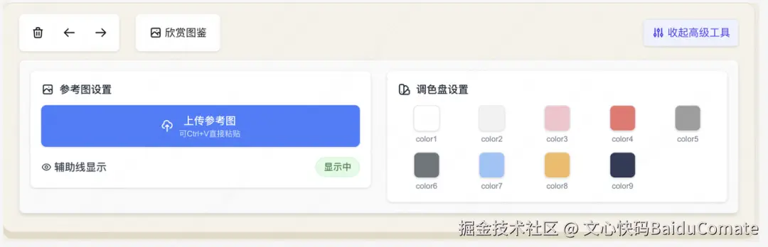然后,我开始调试交互功能,发现可以加一个用户上传图片(便于临摹)的功能。如果自己想,感觉一下午时间又要没了,于是我直接跟Comate说:帮我加个上传图片功能。Comate也很懂我,在工具栏加了这个功能,使用起来也没有问题。
