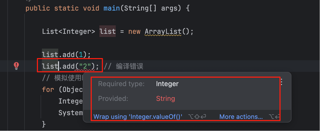 System.out.println(i); // 1正常,"2"运行时报错