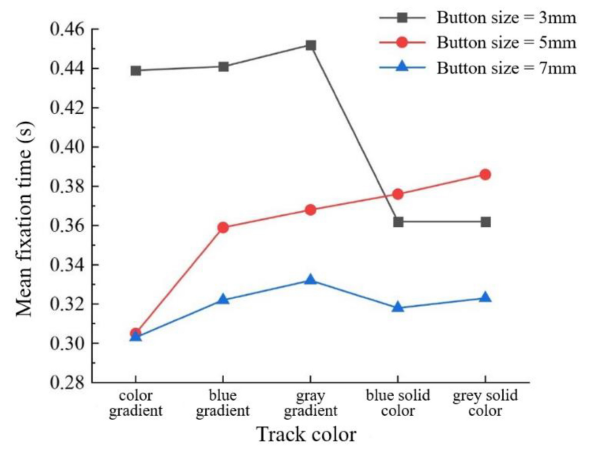 图7:中老年人组不同轨道颜色和按钮大小的平均注视时间