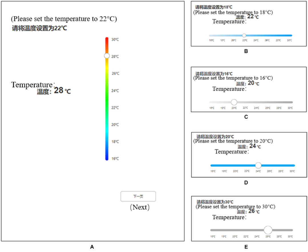 实验前,参与者被告知实验的流程,同时可以随时停止实验。在提供知情同意后,要求参与者填写个人信息问卷,包括人口学信息和身体状况。研究助手测量了参与者右食指的长宽和右臂的长度。然后,通过Flanker任务测试参与者认知能力。将座椅调整到合适的角度和高度并告知操作过程后,要求参与者完成练习任务,练习结束后开始正式实验。整个实验分为三个部分。参与者在每个部分完成后休息3分钟,然后继续进行另一个部分。要求参加者尽快、准确地按照文字提示完成温度设定任务。所有部分完成后,填写用户对按钮设计偏好的问卷。整个实验持续20分钟左右。