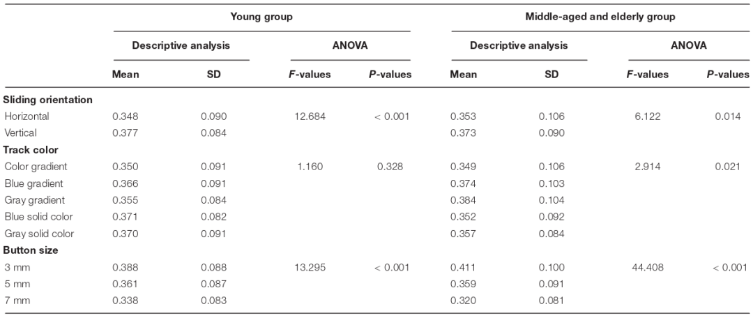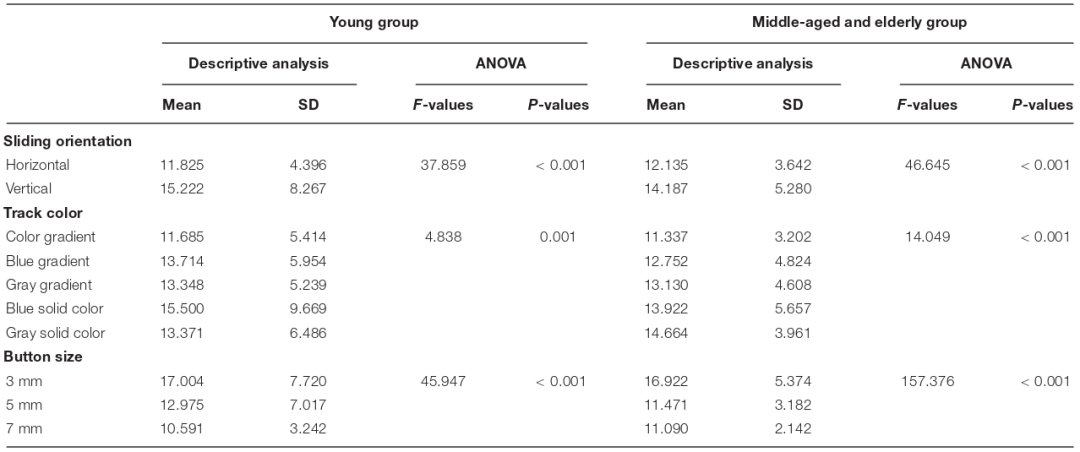 本研究旨在了解智能家居界面按钮特征对不同年龄段人群的影响。设计师和工程师可以在产品设计开发中优先考虑中老年群体,在满足老年人需求的前提下扩大用户群,提高产品的通用性。但由于研究对象分为两组,即青年组和中老年组;各组年龄范围较宽,本研究结果只能提示在用户操作表现上年龄差异较大,后续的研究可以进一步细分被试的年龄。
