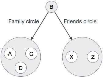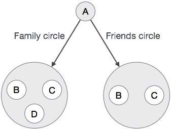 在上图中,轮廓"A"具有圆圈以连接到其他轮廓:家庭圈(B,C,D)和朋友圈(B,C)。