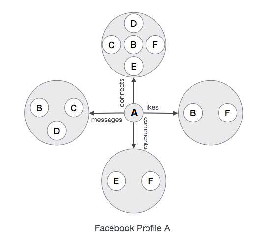 在上面的图中,Facebook Profile"A"已经连接到他的朋友,喜欢他的一些朋友,发送消息给他的一些朋友,跟随他喜欢的一些名人。