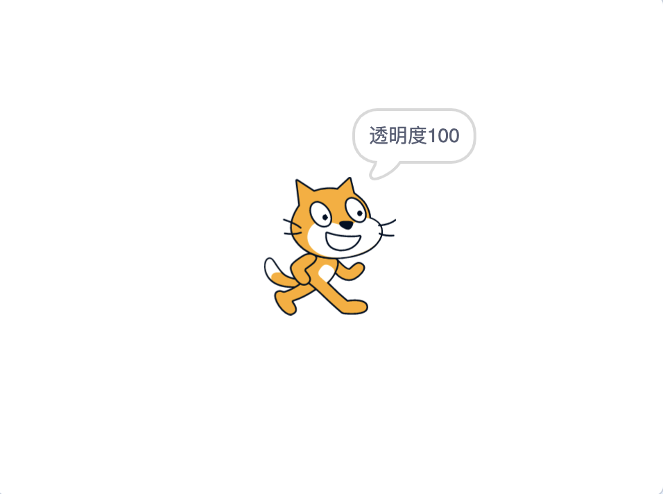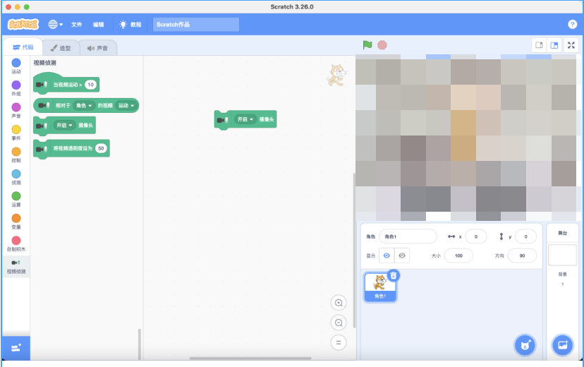 当你打开摄像头之后,你还可以使用**将视频透明度设为...**积木来调整视频画面的透明度。设置为0时,背景中的视频画面最清晰,当数字变大时,画面会开始变的透明,当数字为100时,视频画面会全部消失。