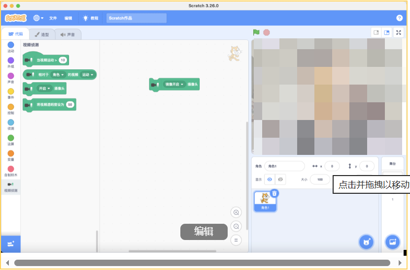 上节课学完了扩展模块中的文字朗读和翻译,这节课我们接着来学习另外一个扩展模块,视频侦测。视频侦测积木可以利用你电脑上面的摄像头,来侦测画面中物体的运动量和运动方向。