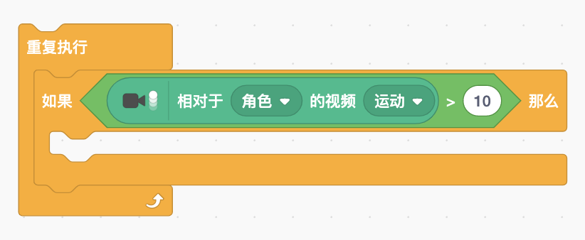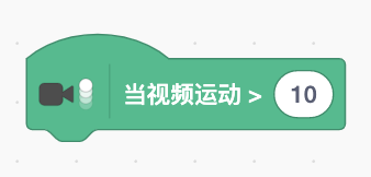 当你在使用时可能会发现,视频侦测的灵敏度很高,那怕你只是非常微小的移动,相对于...的视频... 积木也会返回一个大于0的数字。因此,当你希望它不要太灵敏时,就可以使用**当视频运动 > ...**积木,看着它的形状,你一定能猜出来它也是一个事件积木吧。只有当你的运动量大于某个数字时,才会触发这个事件,从而避免因为视频侦测太灵敏,导致你的游戏无法正常运行。