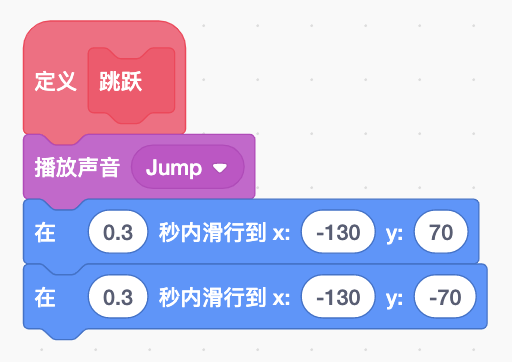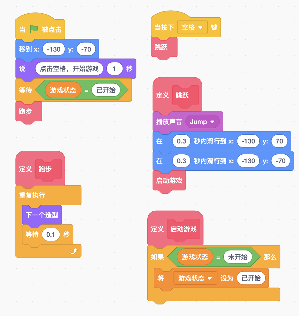 这里已经将跳跃和启动游戏分开执行,所以可以把原来跳跃里面的启动游戏积木删除掉。