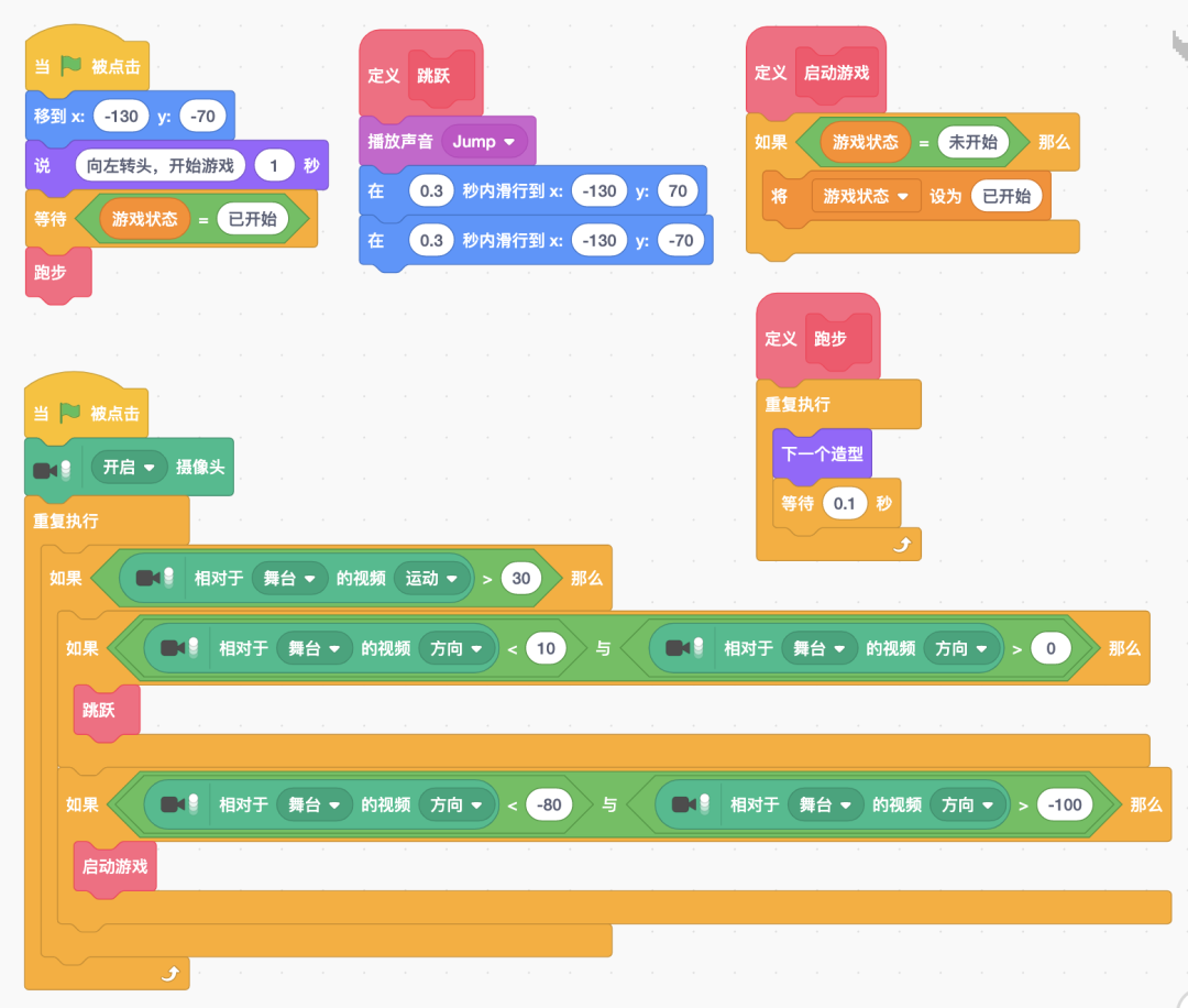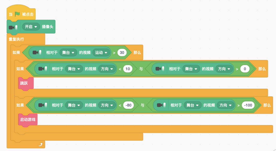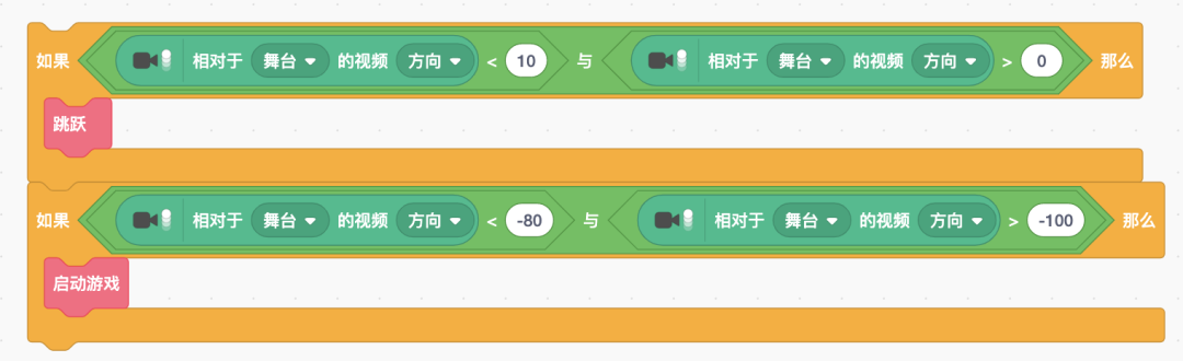 之前的游戏是通过当按下空格键积木做事件监听,每当按下一次就执行一次跳跃,并且在跳跃积木中去启动游戏,那现在需要修改的也就是这个事件积木了。需要将它替换为视频侦测积木的返回值,当返回值在上面说的判断区间时,去执行启动游戏和跳跃积木就可以了。