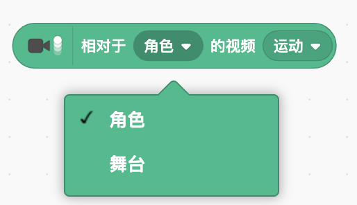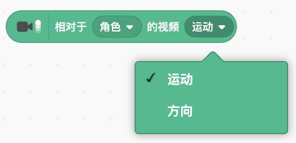 接下来,就是最重要的相对于...的视频... 积木。第一个选项框可以选择角色 和舞台 ,第二个选项框可以选择运动 和方向。使用这个积木就可以侦测到摄像头中物体的运动量和运动方向。