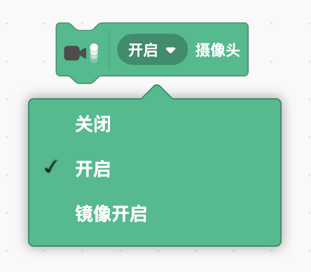 第一个需要使用的是**...摄** 像头 积木,这里面有三个选项,关闭 ,开启 和镜像开启。