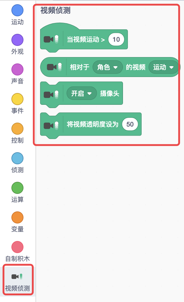 添加进来之后,你会看见在自制积木下面多了一个视频侦测分类,它的里面总共有4个积木块。