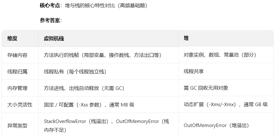 问题 3:JVM 运行时数据区中,堆和栈的核心区别是什么?