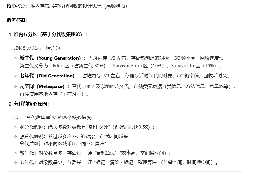 问题 7:JVM 堆内存分为哪些区域?各区域的作用是什么?为什么要分代?