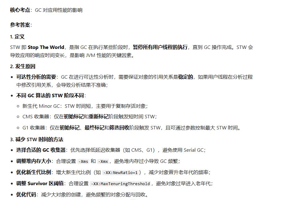 问题 11:GC 中的 STW(Stop The World)是什么?为什么会发生?如何减少 STW 时间?