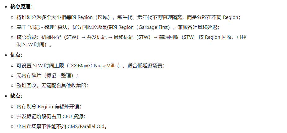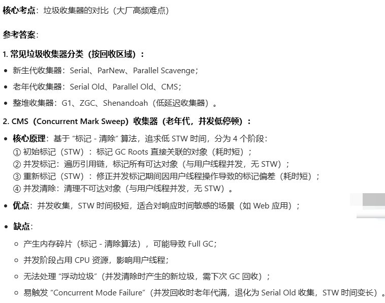 问题 9:常见的垃圾收集器有哪些?CMS 和 G1 的核心原理与优缺点是什么?