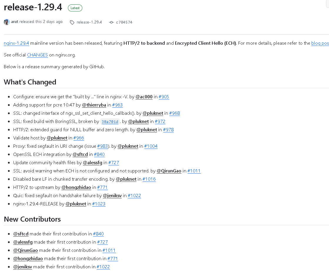 2025年12月11日,nginx 官方发布了 1.29.4 mainline 版本。本次更新带来了多项重要特性与修复,包括 HTTP/2 到后端的支持 、Encrypted Client Hello (ECH) 集成,以及对 SSL、HTTP/2、代理模块的多方改进。以下是本次更新的详细内容: