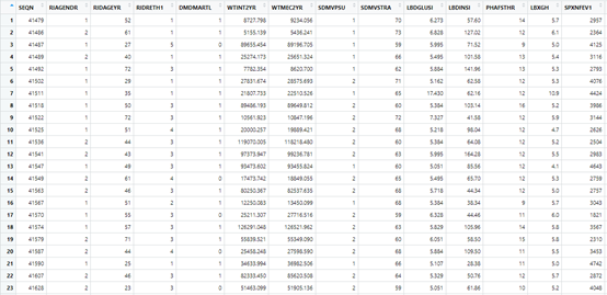 我介绍一下数据,SEQN:序列号,RIAGENDR, # 性别, RIDAGEYR, # 年龄,RIDRETH1, # 种族,DMDMARTL, # 婚姻状况,WTINT2YR,WTMEC2YR, # 权重,SDMVPSU, # psu,SDMVSTRA,# strata,LBDGLUSI, #血糖mmol表示,LBDINSI, #胰岛素( pmmol/L),PHAFSTHR #餐后血糖,LBXGH #糖化血红蛋白,SPXNFEV1, #FEV1:第一秒用力呼气量,SPXNFVC #FVC:用力肺活量,ml(估计肺容量),LBDGLTSI #餐后2小时血糖,factor.FVC是我把肺活量分为了2分类,方便用于测试。