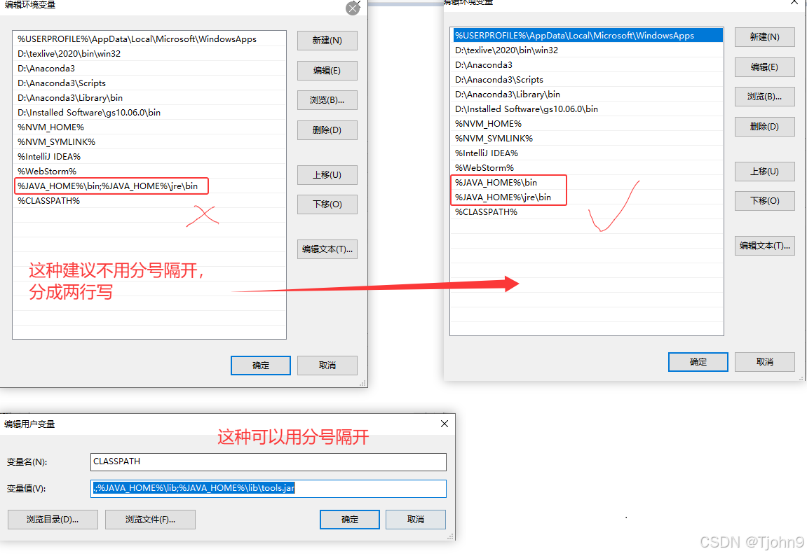 2、设置Path变量时,在我电脑上,用;隔开不生效,写成两行就生效了,如下图: