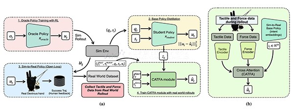 (a)研究工作流程概述。模拟培训和政策提炼;(b)通过CATFA模块在硬件上进行在线调整。