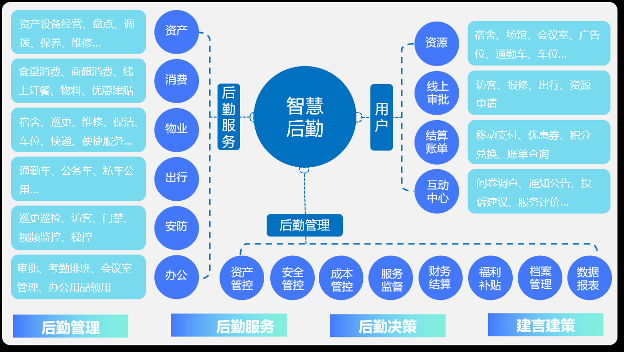 随着高校管理数字化、智能化进程的加速,智慧后勤物业管理系统已成为提升校园服务效率与管理水平的重要工具。该系统通过整合资源、优化流程、强化管控,实现了后勤服务从传统人工模式向智慧化平台的转型。以下将基于典型的功能架构图,对其基本功能进行解析。