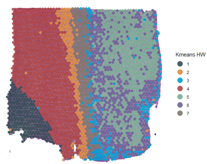 分组变量将样本的观测值划分为可以相互比较属性的组。例如,观测值的分组可以是聚类算法的结果或手动空间分割的结果。本教程将展示如何在SPATA2中应用和添加聚类。