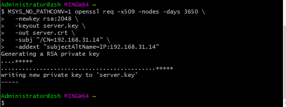MSYS_NO_PATHCONV=1 openssl req -x509 -nodes -days 3650 \