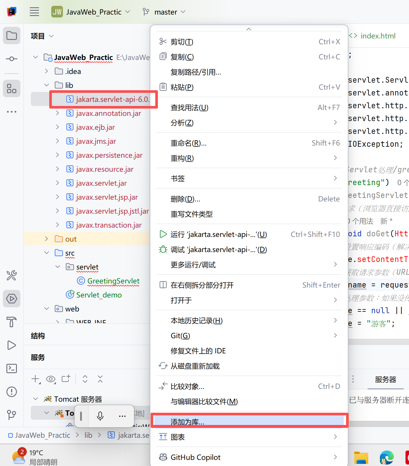 回到IDEA中,找到lib文件夹下的依赖包,将 JAR 包 "添加为库"(让 IDEA 识别依赖)
