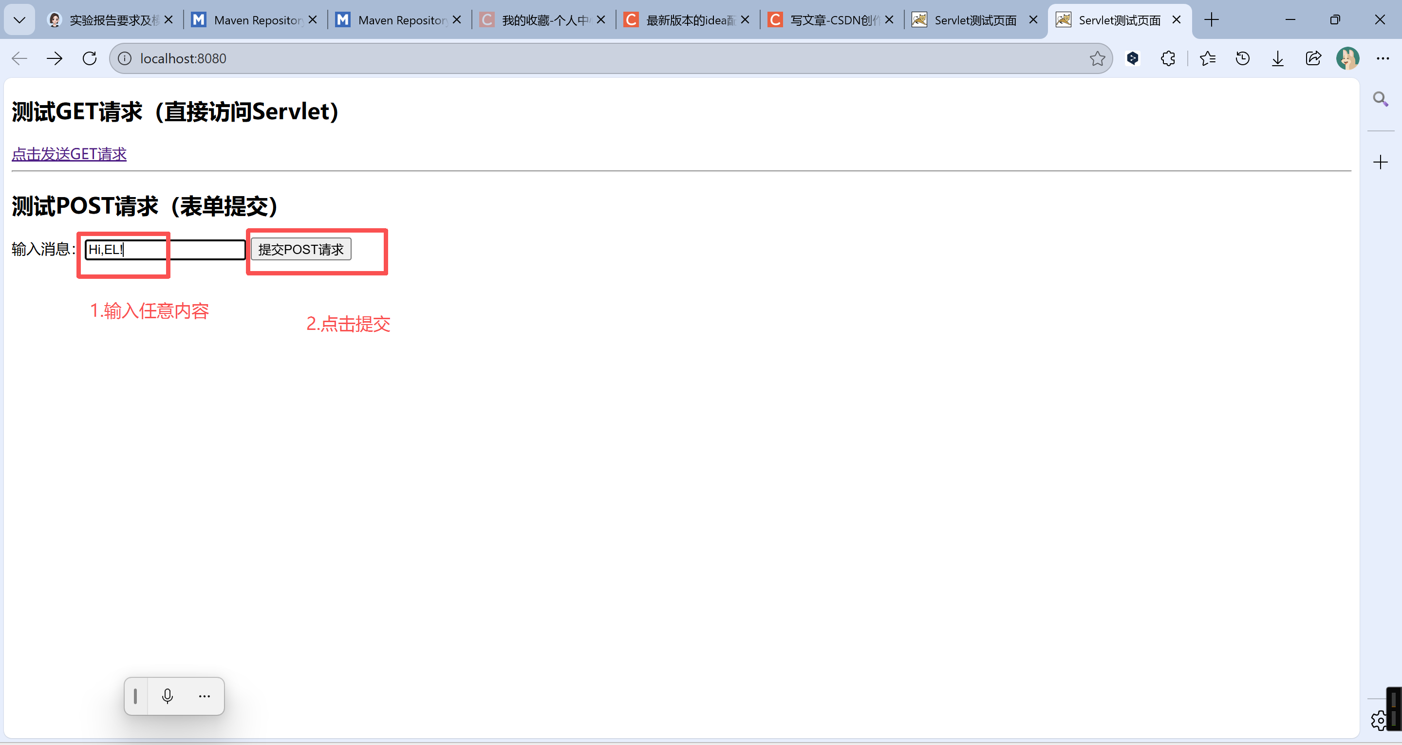 注意:注意,这里接下来可能会出现一个错误:点击"点击发送GET请求"和输入消息内容之后点击"提交POST请求"出来的网页是404