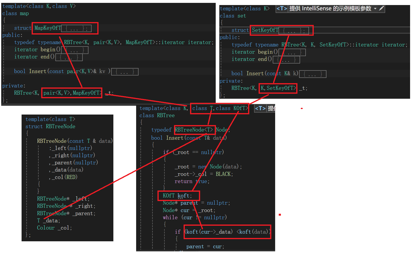 T适配存储类型(键 / 键值对),通过仿函数KOfT统一键提取规则; - 无冗余复用:无需为 map/set 分别实现红黑树,仅需适配模板参数,极大减少代码冗余。