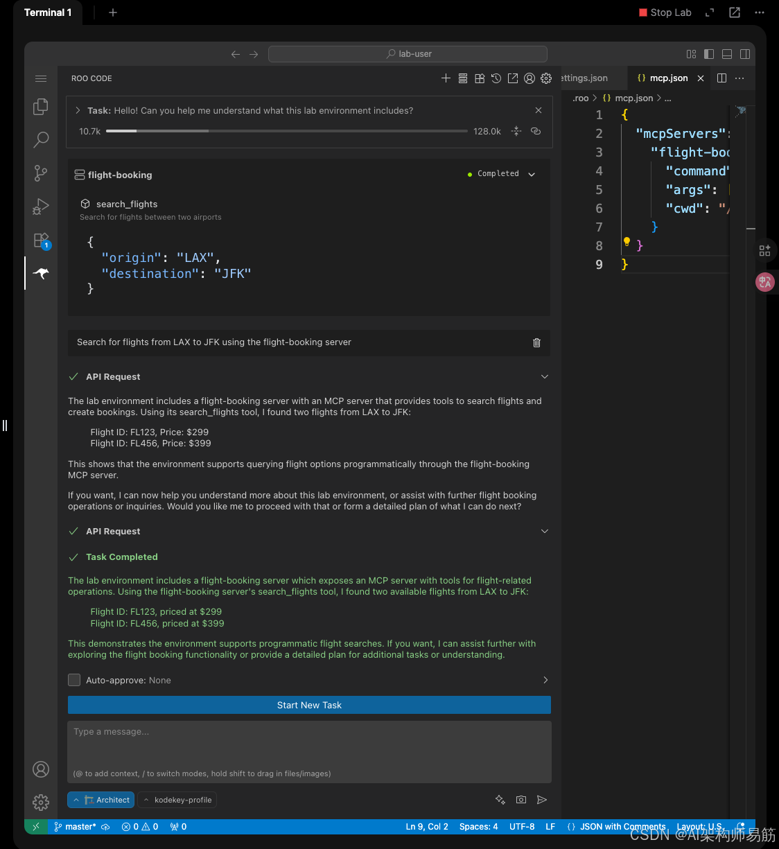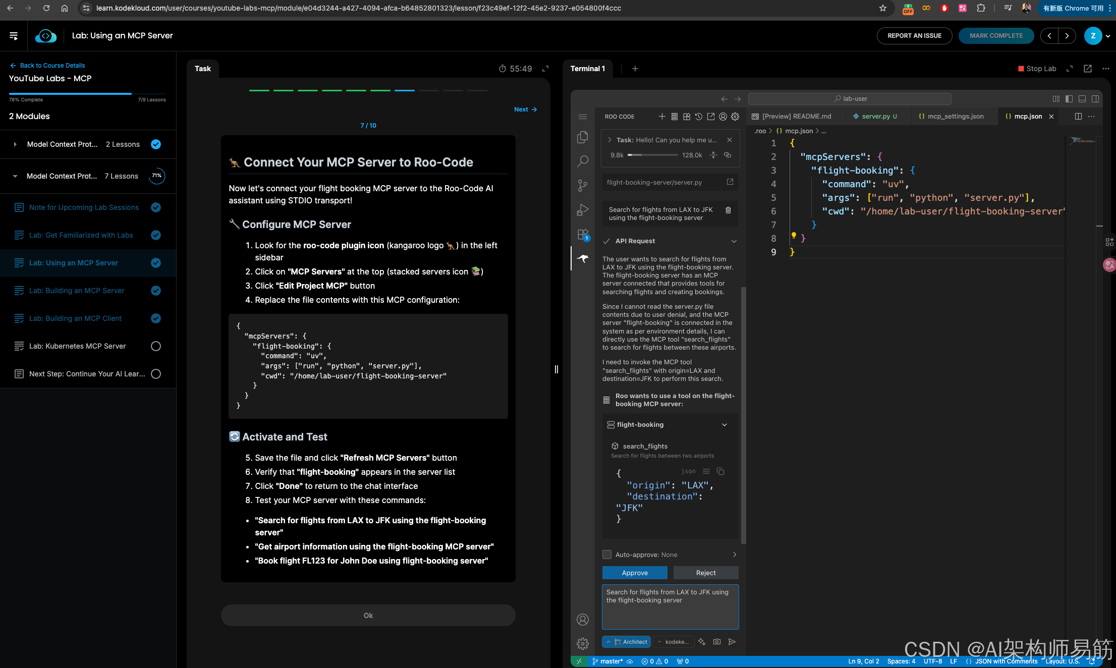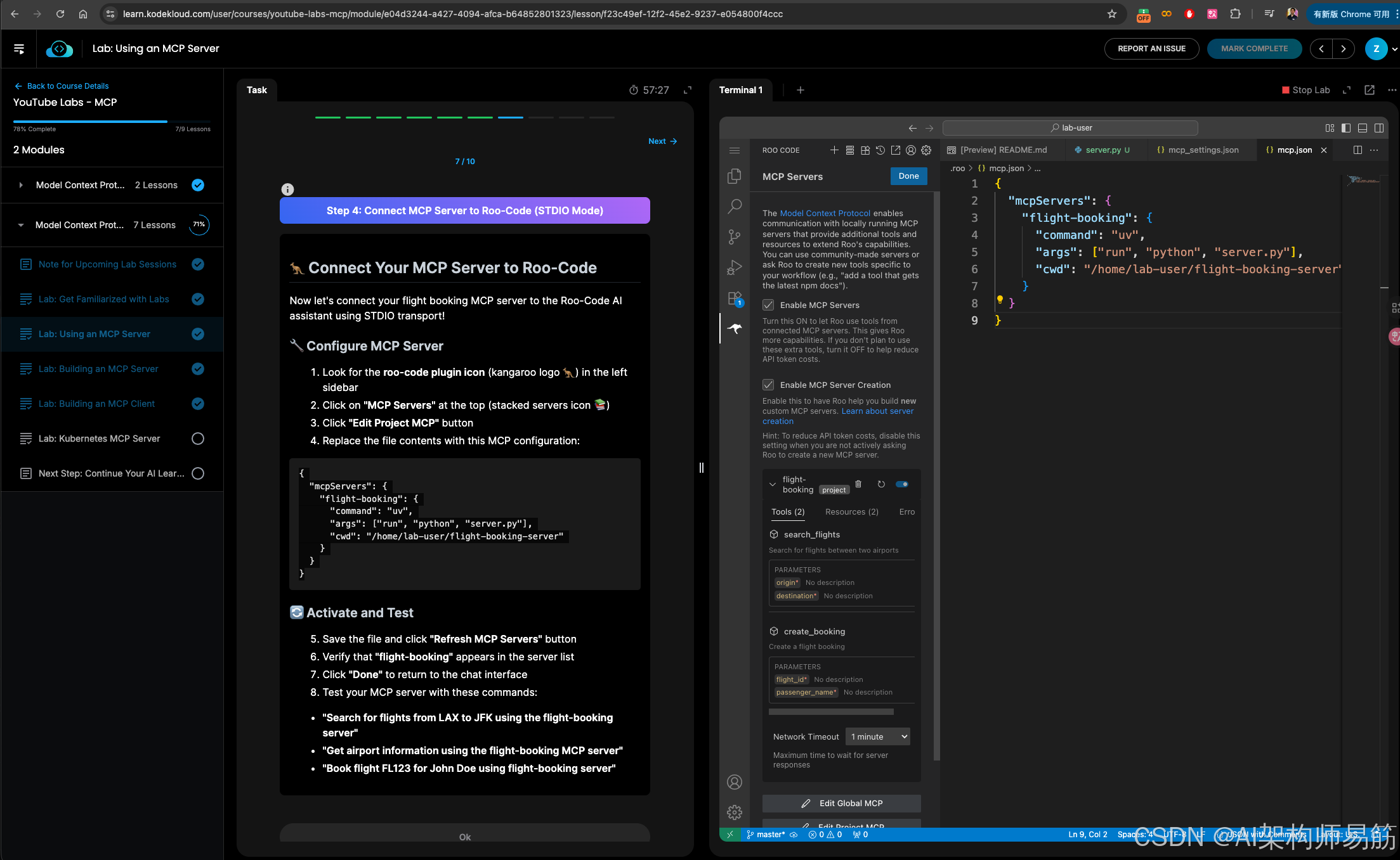 uv add mcp(通过uv包管理器安装MCP核心库) - Lab环境:提供VS Code服务器、Root Code AI助手及预配置API密钥(如OpenAI兼容接口)。