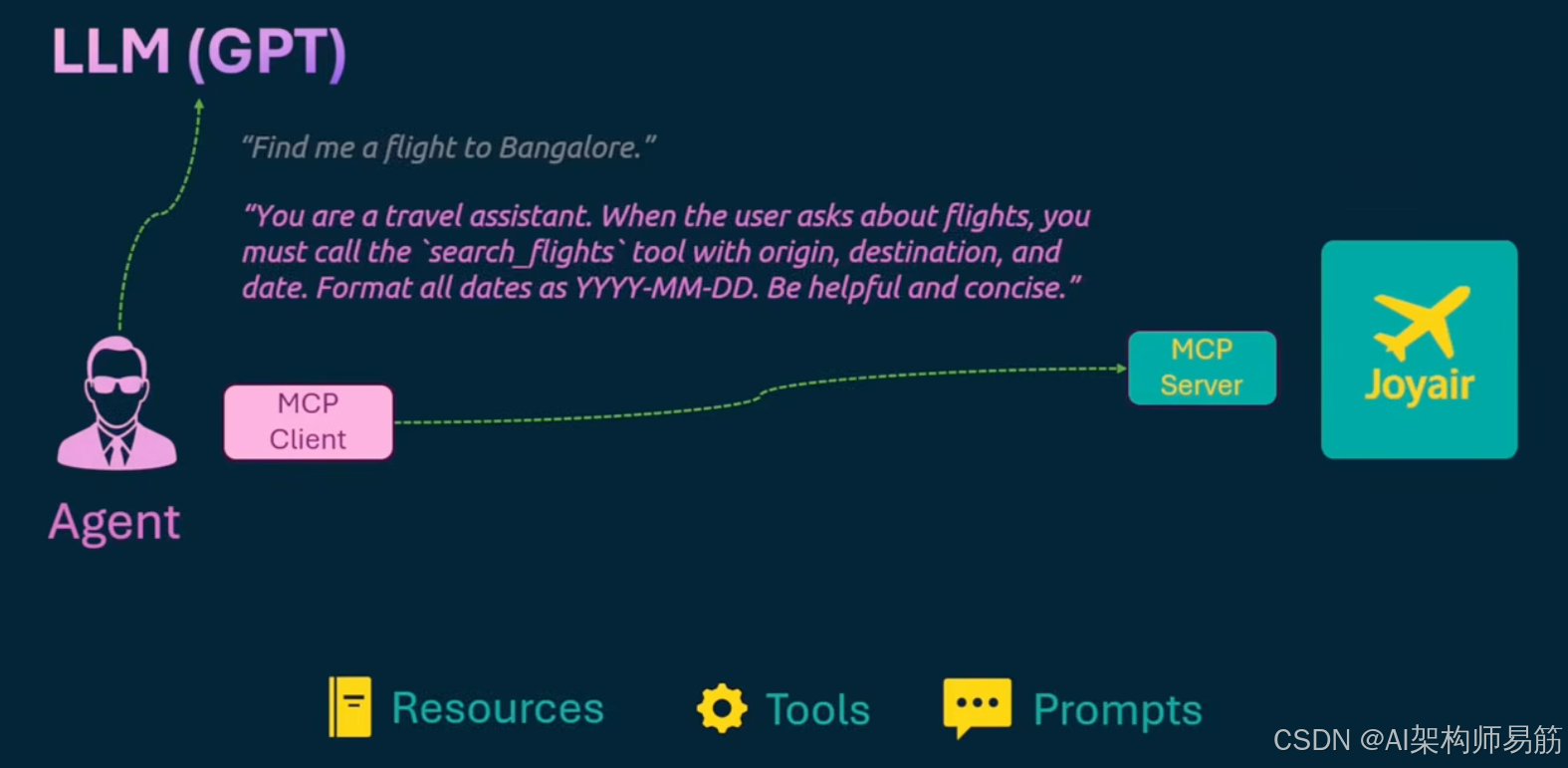 | 提示(Prompts) | 预定义指令模板,优化LLM交互效果 | "作为旅行助手,调用search_flights工具时需指定origin/destination/date参数,日期格式为YYYY-MM-DD" |