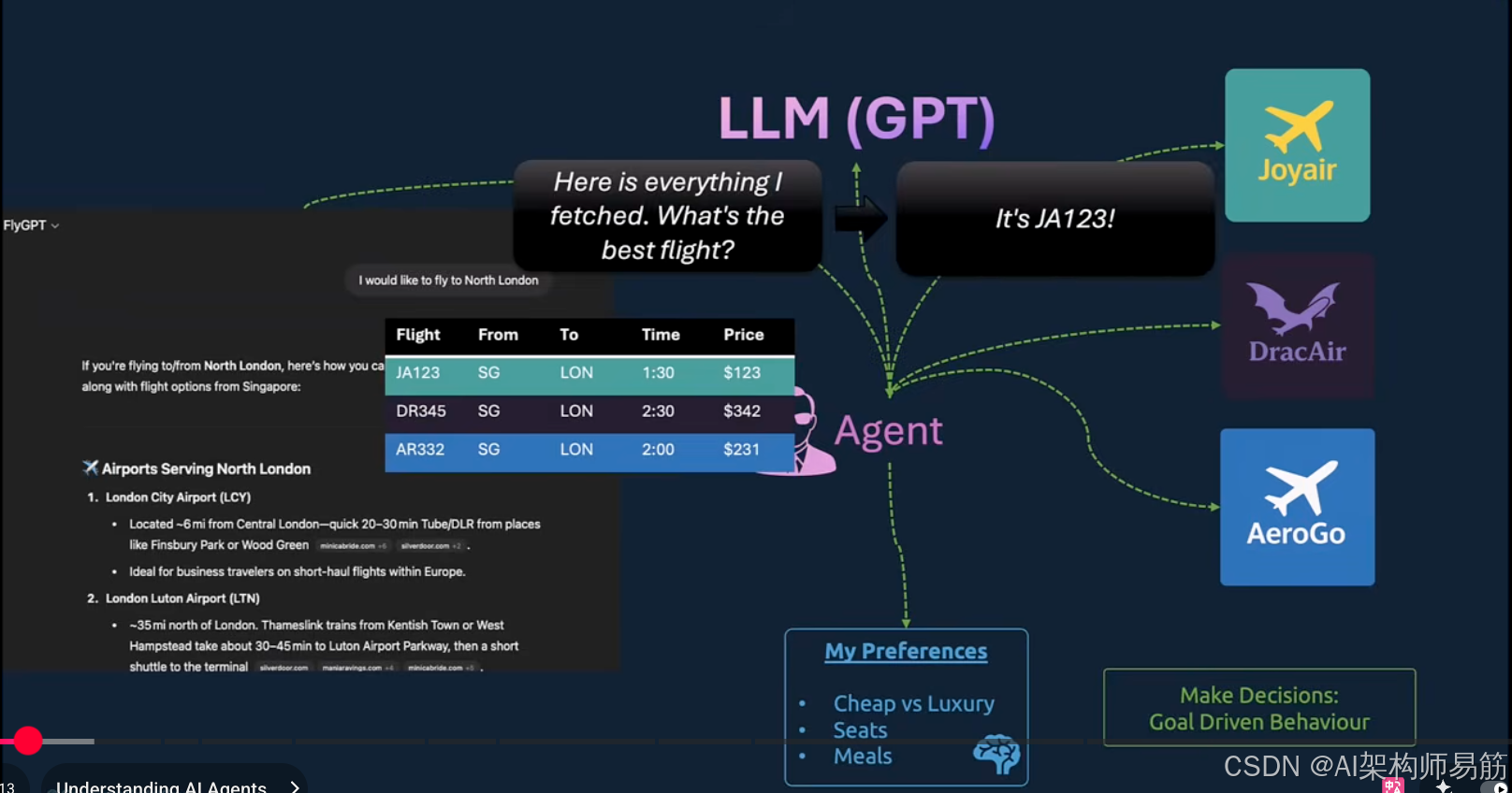 - 用户输入解析:AI代理调用LLM识别用户意图(如"飞往伦敦"→提取目的地、日期等参数)。