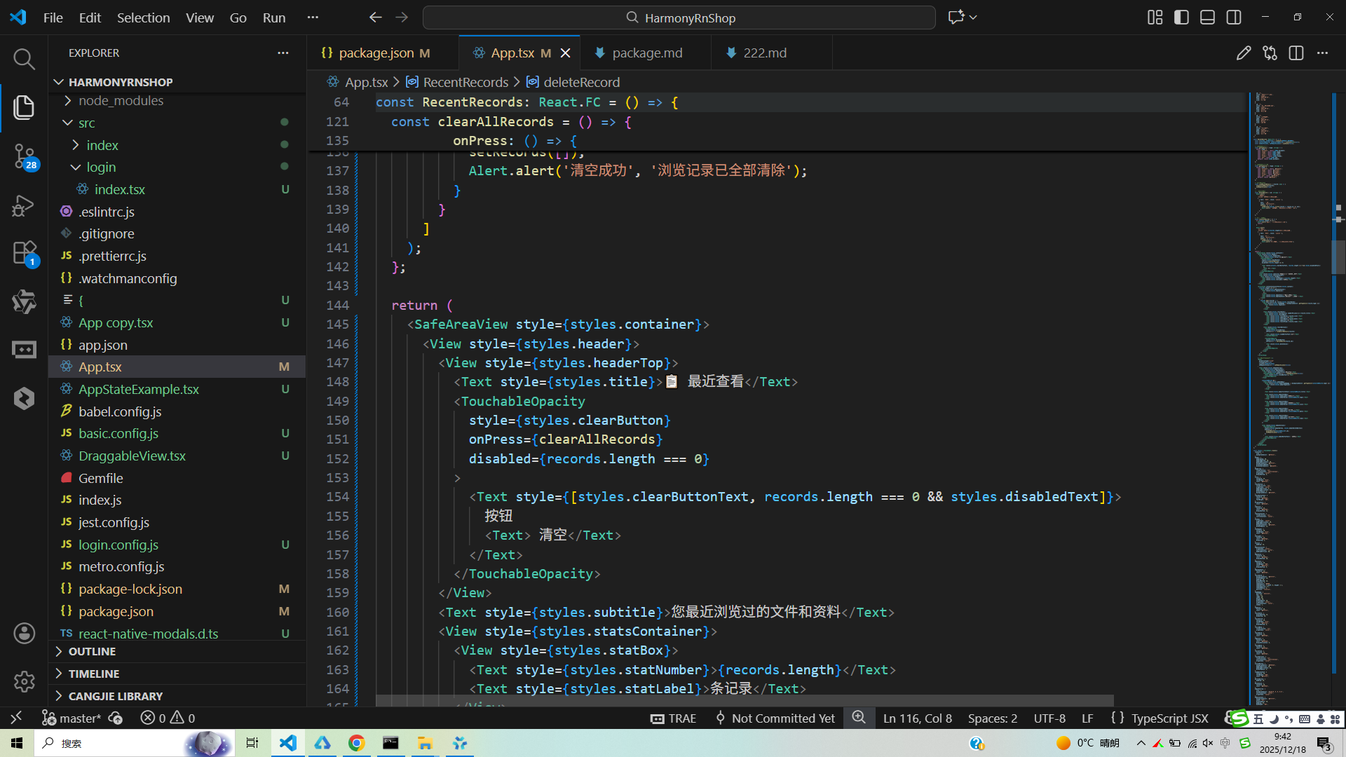 在React Native中开发Harmony组件(Harmony组件这里指的是一个特定的组件,可能是指某个特定的功能或UI组件,例如一个记录管理组件),你可以遵循以下步骤。我将以一个简单的"最近查看记录管理"组件为例,展示如何实现它。
