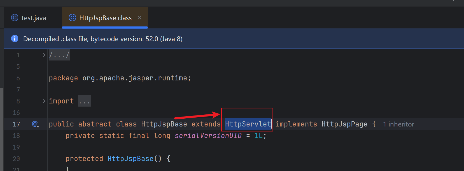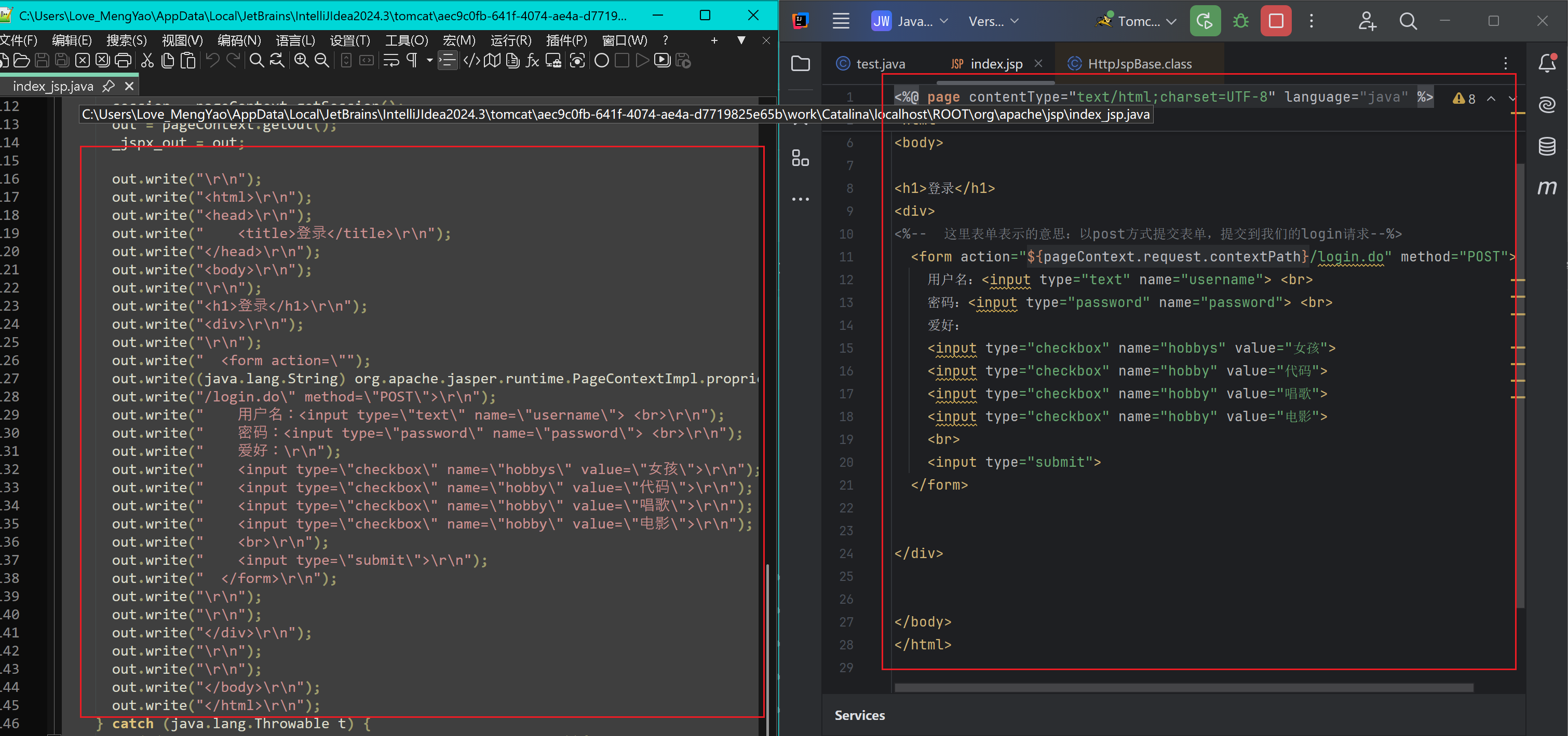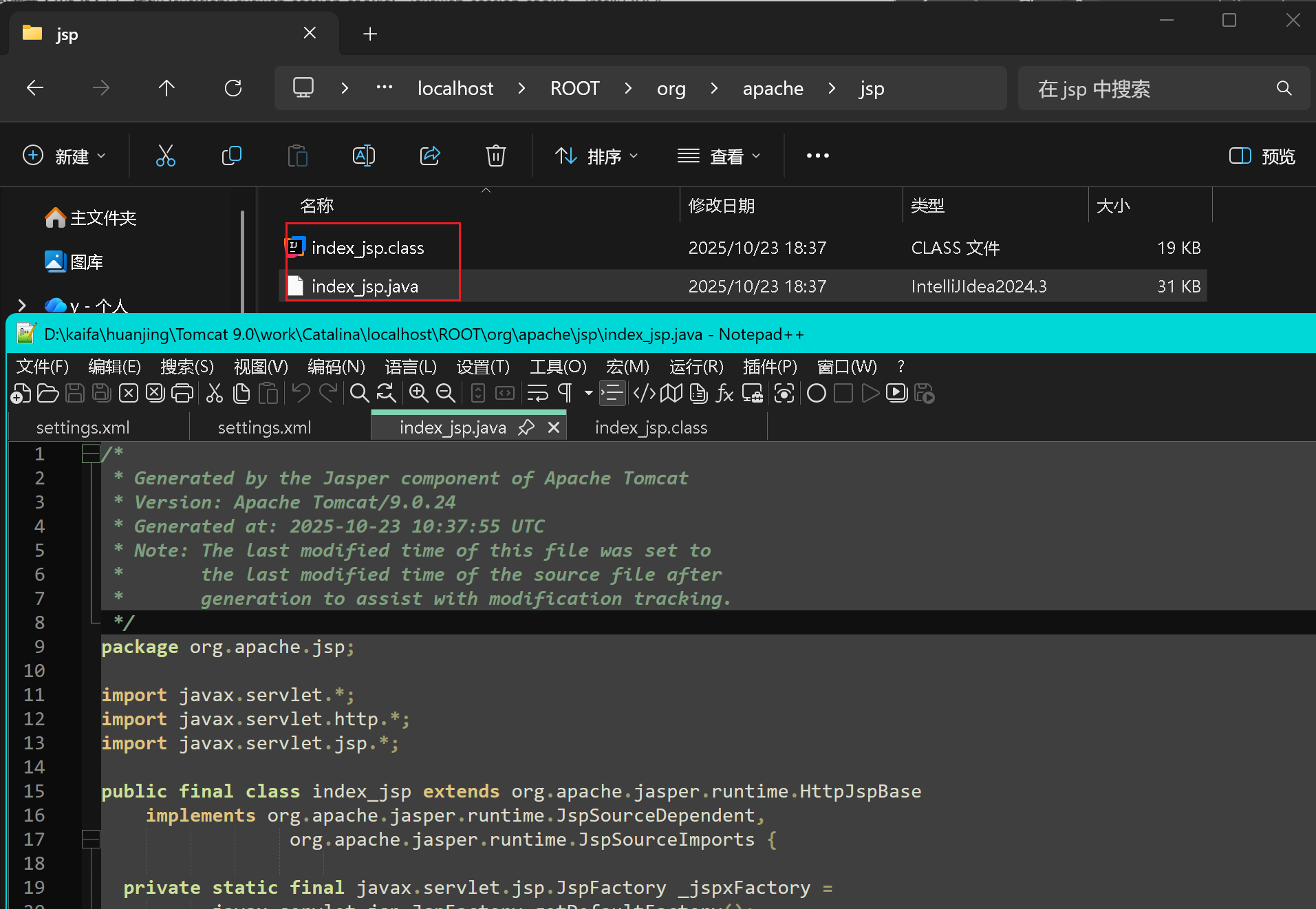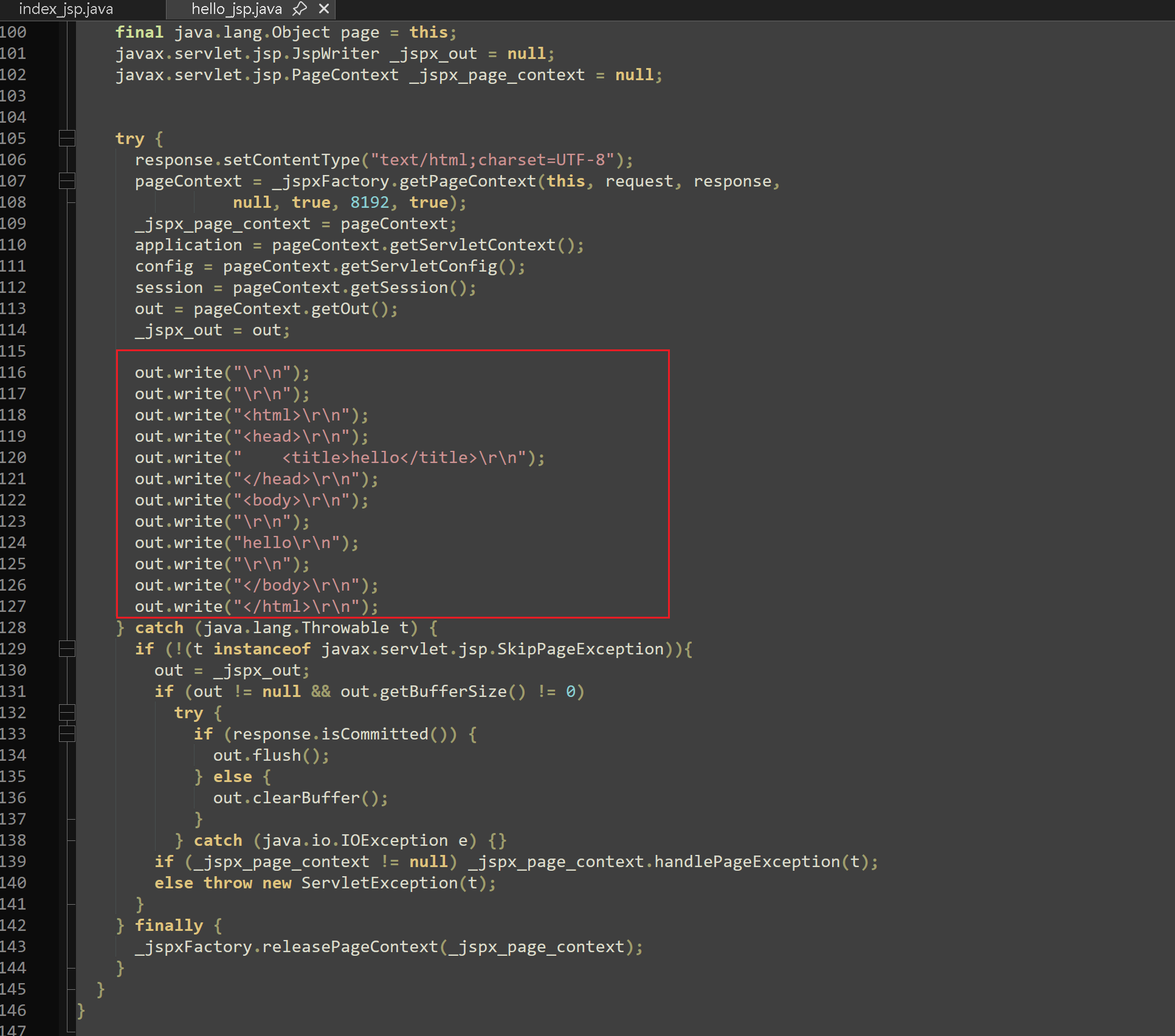 可以发现打开的index_jsp.java 其实是index.jsp 编写的内容,实际上都是由java类实现的,我们只需要编写简单的代码即可