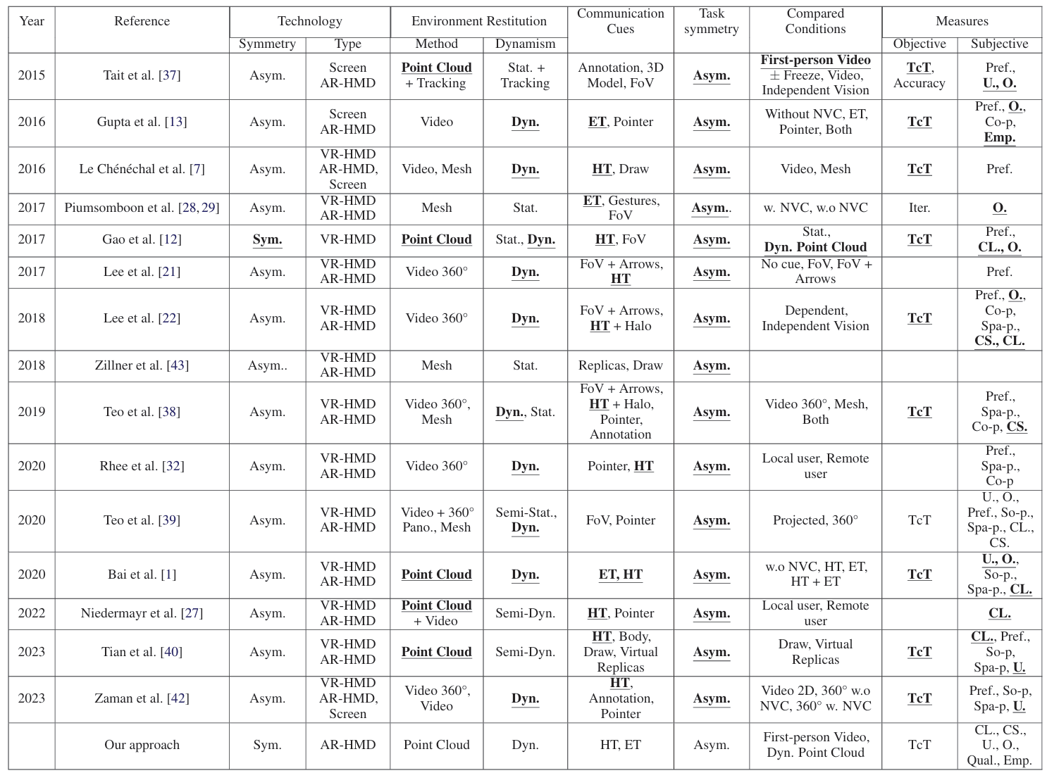 Table1:ClassificationofRPC-XRstudiescitedinthisarticle. Itemsinboldaresimilartooursystem.TechnologyacronymsareAsymmetric(Asym.), Symmetric(Sym.),VirtualRealityHeadMountedDisplay(VR-HMD),andAugmentedRealityHeadMountedDisplay(AR-HMD).Environment RestitutionacronymsarePanoramas(Pano.),Dynamic(Dyn.)andStatic(Stat.).CommunicationCues:EyeTracking(ET),HandTracking(HT),and FieldofViewfrustum(FoV).Conditionsacronymsarenon-verbalcommunication(NVC),with(w.),andwithout(w.o.).MeasuresacronymsareTask CompletionTime(TcT),Iterations(Iter.),Preferences(Pref.),Observations(O.),Co-presence(Co-p.),Spatial-presence(Spa-p.),Social-presence (So-p.),CognitiveLoad(CL.)Cybersickness(CS.),Empathy(Emp.),Usability(U.),andQuality(Qual.).Thehomogeneityofdifferentpresence measuresisbasedondefinitionsprovidedbyLombardetal.[23].