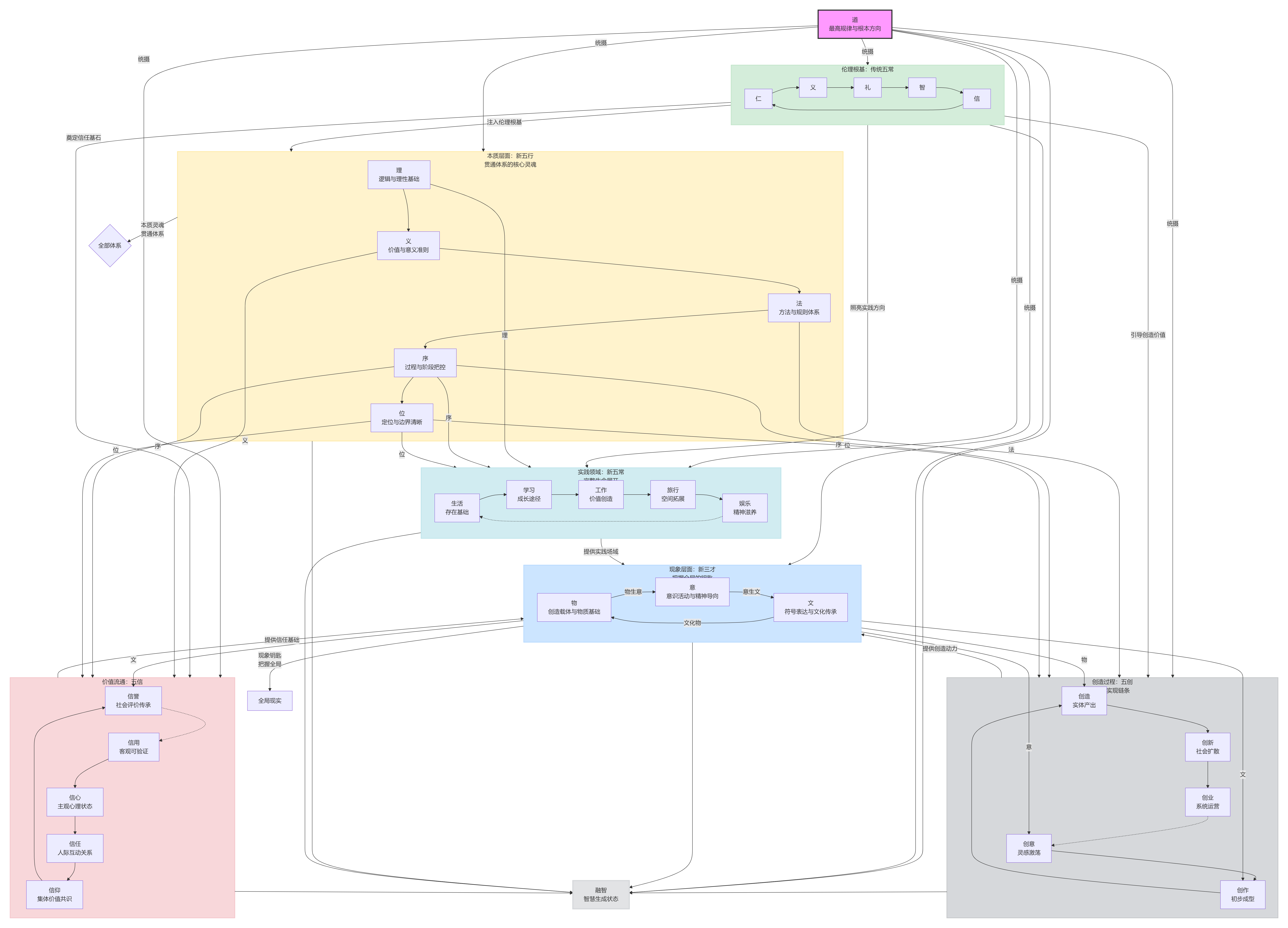 体系构建一个从最高规律到具体实践、从伦理根基到创新前沿的完整逻辑链条,各部分之间形成了有机的互动网络。