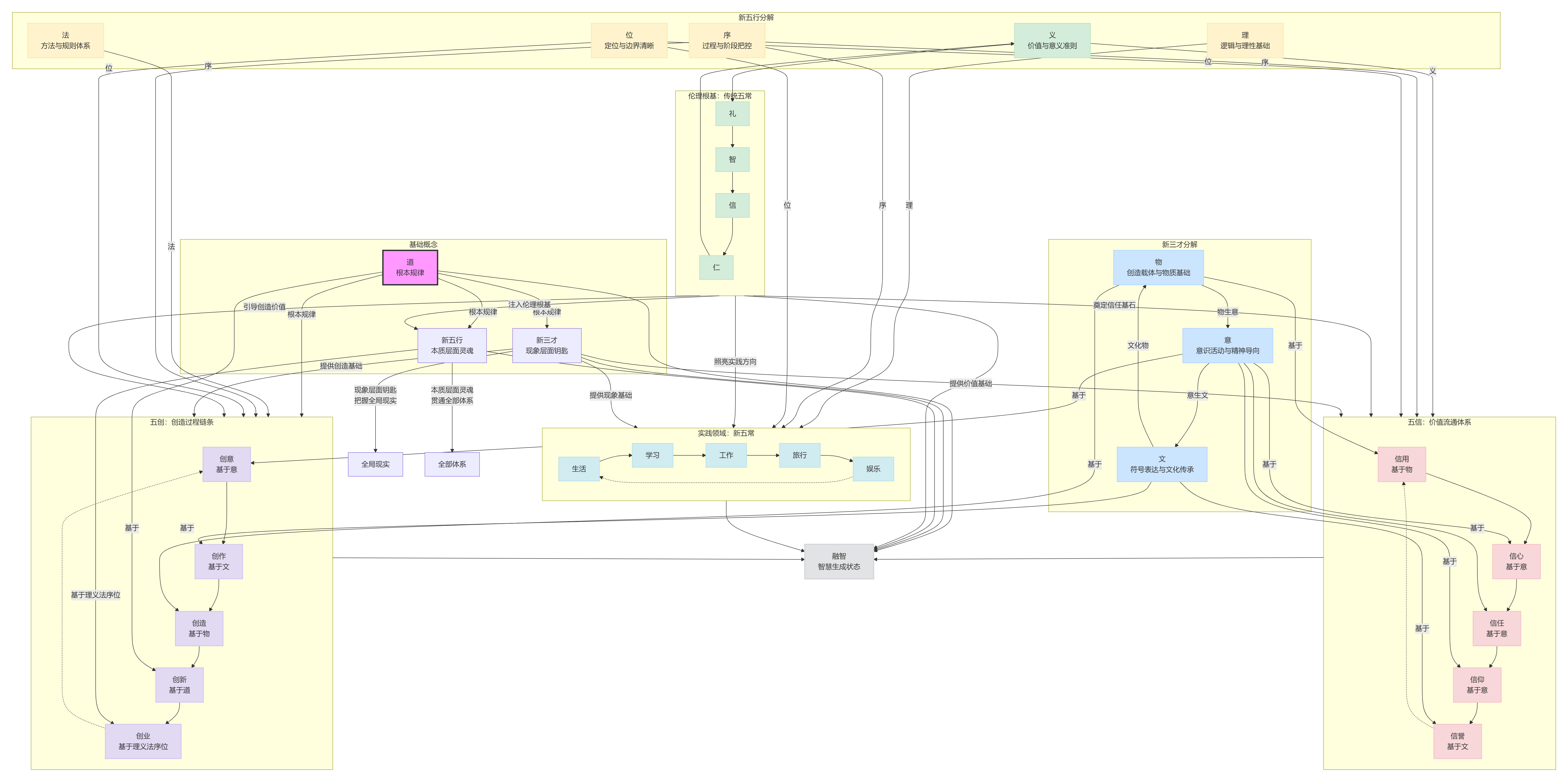 新五行(理、义、法、序、位)作为本质层面的灵魂,横向贯通并连接着其他体系;