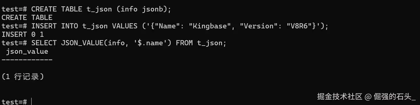 -- 假设表中有一条 JSON 数据:{"Name": "Kingbase", "Version": "V8R6"}