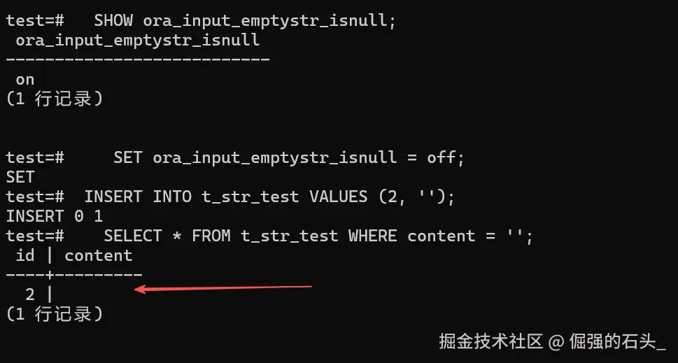 sql-- 查看当前参数 SHOW ora_input_emptystr_isnull; -- 关闭自动转换(仅当前会话生效) SET ora_input_emptystr_isnull = off; -- 再次测试 INSERT INTO t_str_test VALUES (2, ''); SELECT * FROM t_str_test WHERE content = ''; -- 此时能查到 id=2 的记录